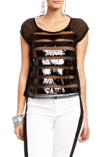 The perfect tee with a little pizzazz. Sheer chiffon back with banded cut-outs and a mesh insert front featuring luxe bronze sequin stripes. Wear over a cami with light wash denim and studded flats.