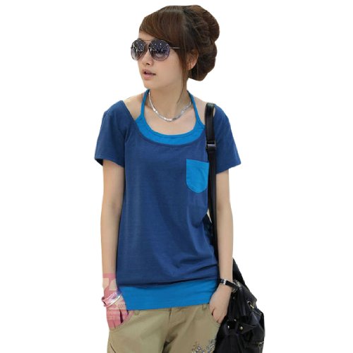 Halter Neck, Fake Two Pieces, Short Sleeve, Pullover, Stretchy, Pocket Top, Casual Tee Shirt.The model in our picture is about 5.3 Ft in height.Women Tee Shirt ONLY, other accessories photographed not included.Please check your messurements to make sure the item fits before ordering.
