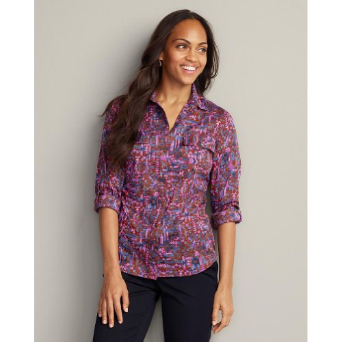 Fresh patterns and colors update our versatile roll-sleeve blouse. Two chest pockets; center back seam for subtle shaping. Long sleeves with roll-up button tabs. Classic fit. Imported.