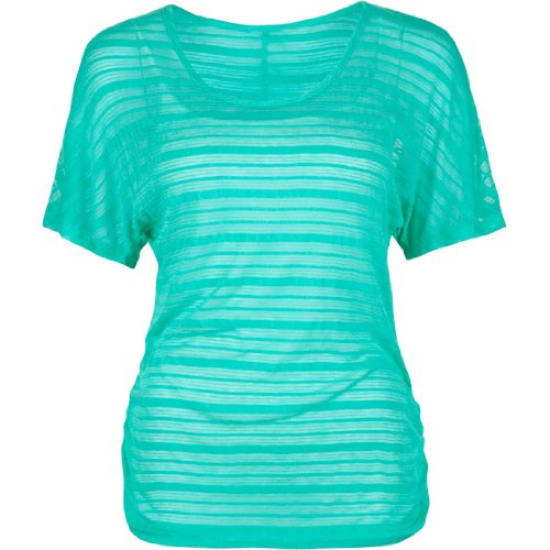 Essentials by Full Tilt hachi tunic. Allover horizontal woven stripes. Sheer. Cinching on sides above waist. Short dolman sleeves. Scoop neck. 97% rayon/3% spandex. Hand wash. Made in USA.